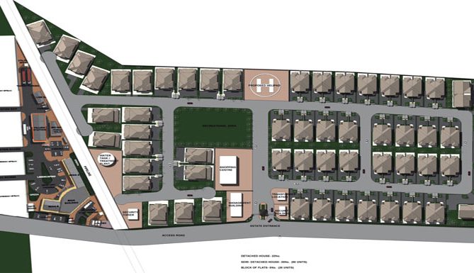 Spanning within a reserved gated neighbourhood which is adorned with well laid and paved roads, adequate security, street lighting and other attraction inclusive of shopping facility, green belt/play ground, swimming, Helipad Landing and constant water supply. The estate building will constitute houses of various designs such as:
